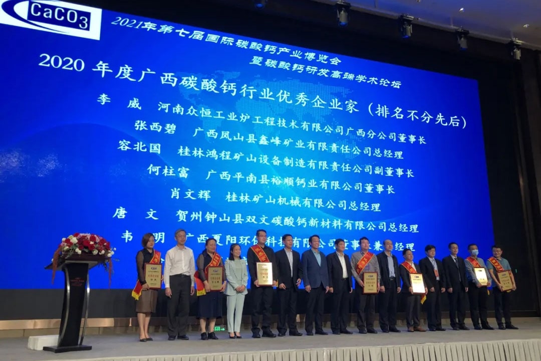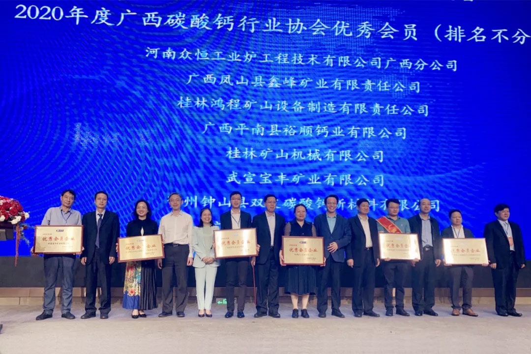 桂林礦機(jī)作為礦山機(jī)械的重要一員,公司從第一屆開始積極參與協(xié)會會議會展,公司領(lǐng)導(dǎo)也非常支持協(xié)會各項(xiàng)工作并投身綠色發(fā)展道路。會中,公司領(lǐng)導(dǎo)肖文輝獲得2020年度廣西碳酸鈣行業(yè)優(yōu)秀企業(yè)家,同時(shí)公司還榮獲了廣西碳酸鈣行業(yè)協(xié)會優(yōu)秀會員獎(jiǎng)。