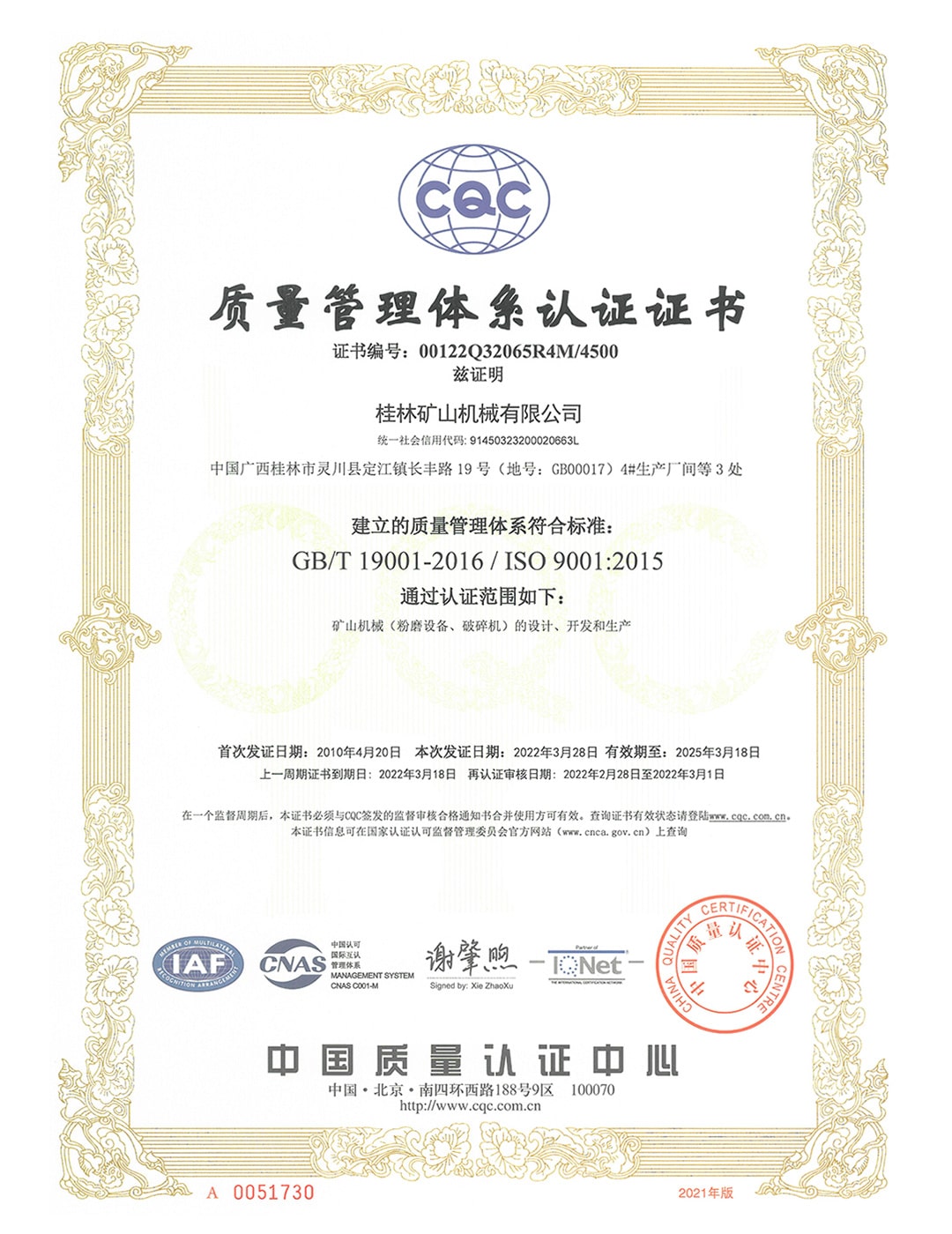 為使每一臺(tái)出廠的產(chǎn)品品質(zhì)得到保證,桂林礦機(jī)建有多條現(xiàn)代化先進(jìn)設(shè)備生產(chǎn)線,以嚴(yán)謹(jǐn)?shù)墓芾砹鞒瘫U厦康拦ば蚨挤瞎に嚵鞒毯虸SO9001:2015質(zhì)量管理體系標(biāo)準(zhǔn),力求每一處細(xì)節(jié)都經(jīng)得起考驗(yàn),保證產(chǎn)品在各個(gè)制造階段的整體品質(zhì)。