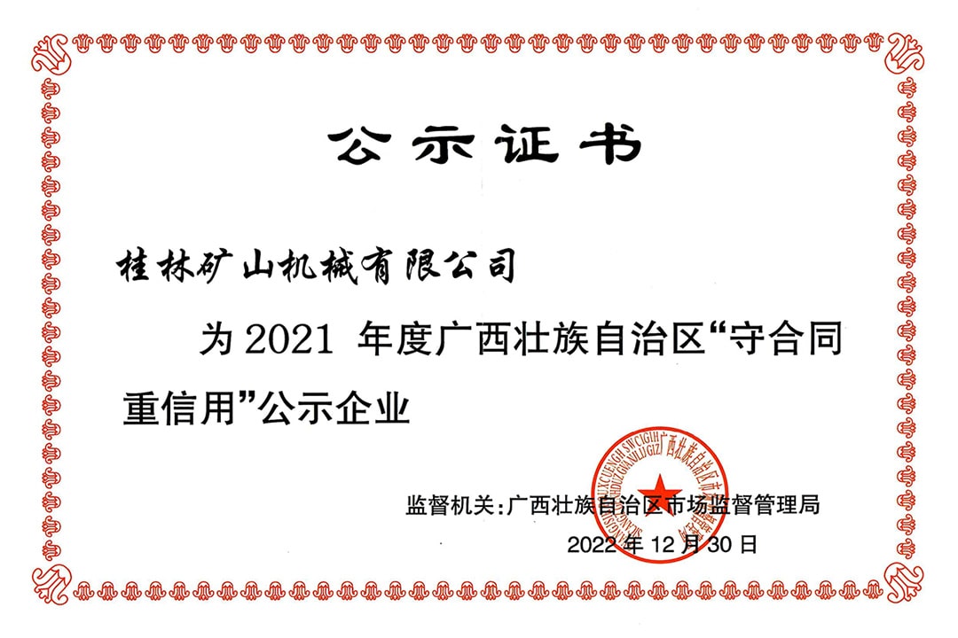 2022年末,自治區(qū)市場(chǎng)監(jiān)督管理局發(fā)布了《關(guān)于公示廣西2021年度“守合同 重信用”企業(yè)名單的通告》,桂林礦機(jī)憑借誠(chéng)信的經(jīng)營(yíng)理念和良好的市場(chǎng)信譽(yù)等優(yōu)勢(shì),再獲“守合同 重信用”企業(yè)榮譽(yù)稱號(hào)。這份殊榮不僅是桂林礦機(jī)持續(xù)耕耘“以信為本”的努力付出的結(jié)果,更是桂林礦機(jī)“技術(shù)升級(jí)、研發(fā)升級(jí)、工藝升級(jí)、文化升級(jí)”的錘煉升級(jí)。