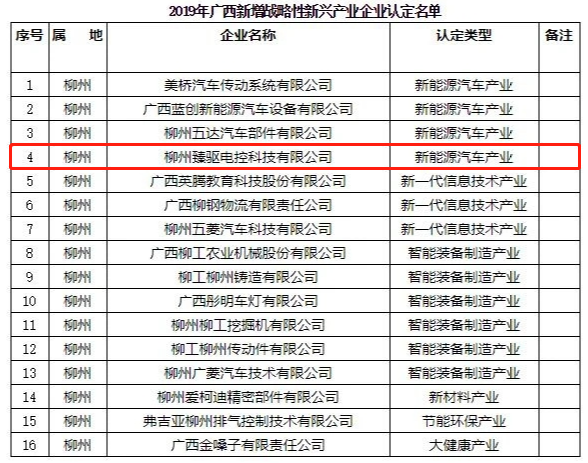 2020年5月,廣西壯族自治區新興產業發展辦公室發布了《關于公布2019年廣西新增戰略性新興產業企業認定名單的通知》,認定全區103家企業為2019年廣西新增戰略性新興產業企業,作為電機控制器及其核心零部件產品研發、生產和銷售為一體的新能源動力總成核心零部件供應商,柳州臻驅成功入圍該批戰略性新興企業認定。