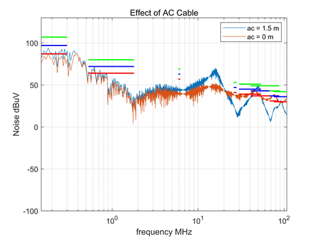 圖3 基于單電控的噪聲頻率對比,AC側采用直插形式后可觀察到原長線纜帶來的高頻行波振蕩消除